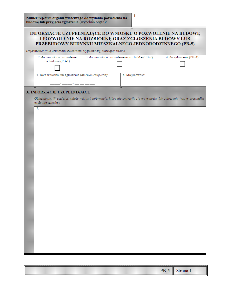 Poniżej wzory nowego wniosku o pozwolenie na budowę (PB-1) oraz informacji uzupełniającej (PB-5) wprowadzonych Rozporządzeniem Ministra Infrastruktury i Rozwoju z dnia 24.07.2015 r. w sprawie wzorów: wniosku o pozwolenie na budowę, oświadczenia o posiadanym prawie do dysponowania nieruchomością na cele budowlane, decyzji o pozwoleniu na budowę, oraz zgłoszenia budowy i przebudowy budynku mieszkalnego jednorodzinnego (Dz. U. z 2015 r. poz. 1146).